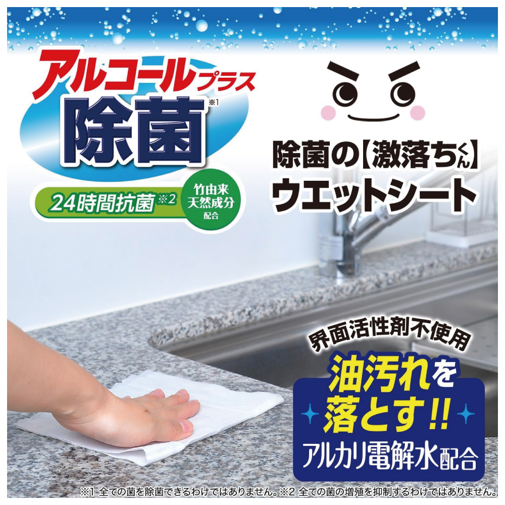 ●キッチンまるごと除菌!アルコール30%配合の除菌ができる激落ちくんお掃除ウェットシートです。