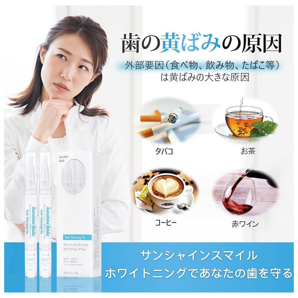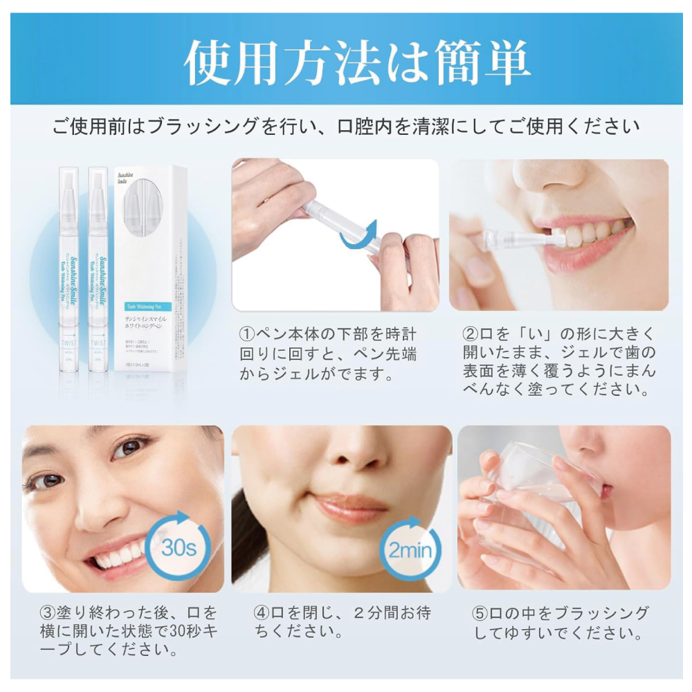 ホワイトニングペ.ンを使用して、数日以内に明るくなり、歯を白くします。1日2回使用を推薦します。 2週間(14日間)以上続けていただくと、黄ばみ・汚れが落ちて歯のホワイトニング効果をより実感できると思います。