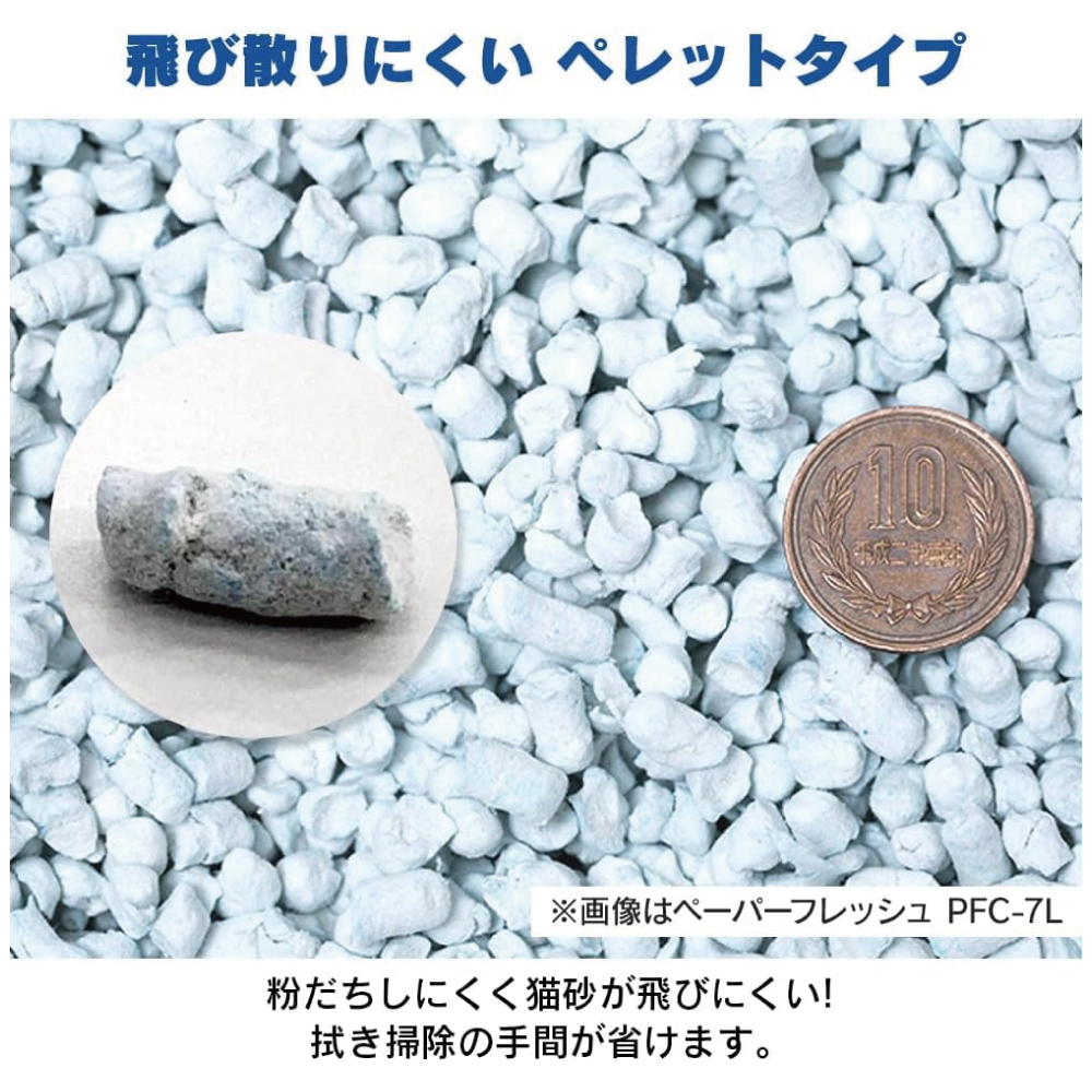 粉だちしにくく猫砂がとびにくい、大きめなペレットタイプ。