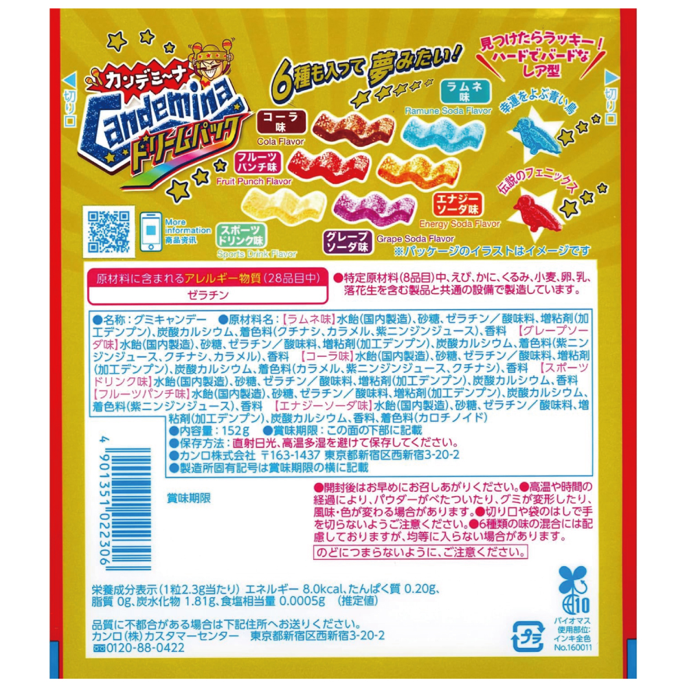 【エナジーソーダ味】水飴(国内製造)、砂糖、ゼラチン/酸味料、増粘剤(加工デンプン)、炭酸カルシウム、香料、着色料(カロチノイド)