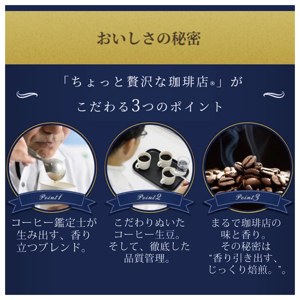 "お湯を注ぐと贅沢ブラック。"「ちょっと贅沢な珈琲店」インスタントコーヒーは、季節や産地特徴によって世界中からコーヒー豆を選定。豆の個性を引き出す焙煎と抽出。珈琲店のマスターが淹れたような香り・味をパウダーに閉じこめました。