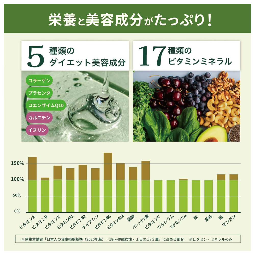 【1杯で22種類の ダイエット ・ 美容 ・ 健康栄養素】 1杯で完結できるように、『5種類の ダイエット ・ 美容 成分』『11種類の ビタミン &6種類の ミネラル 』を贅沢に配合しております。日々の栄養バランスから ダイエット ・ 美容 まで、全てをトータルサポートします。