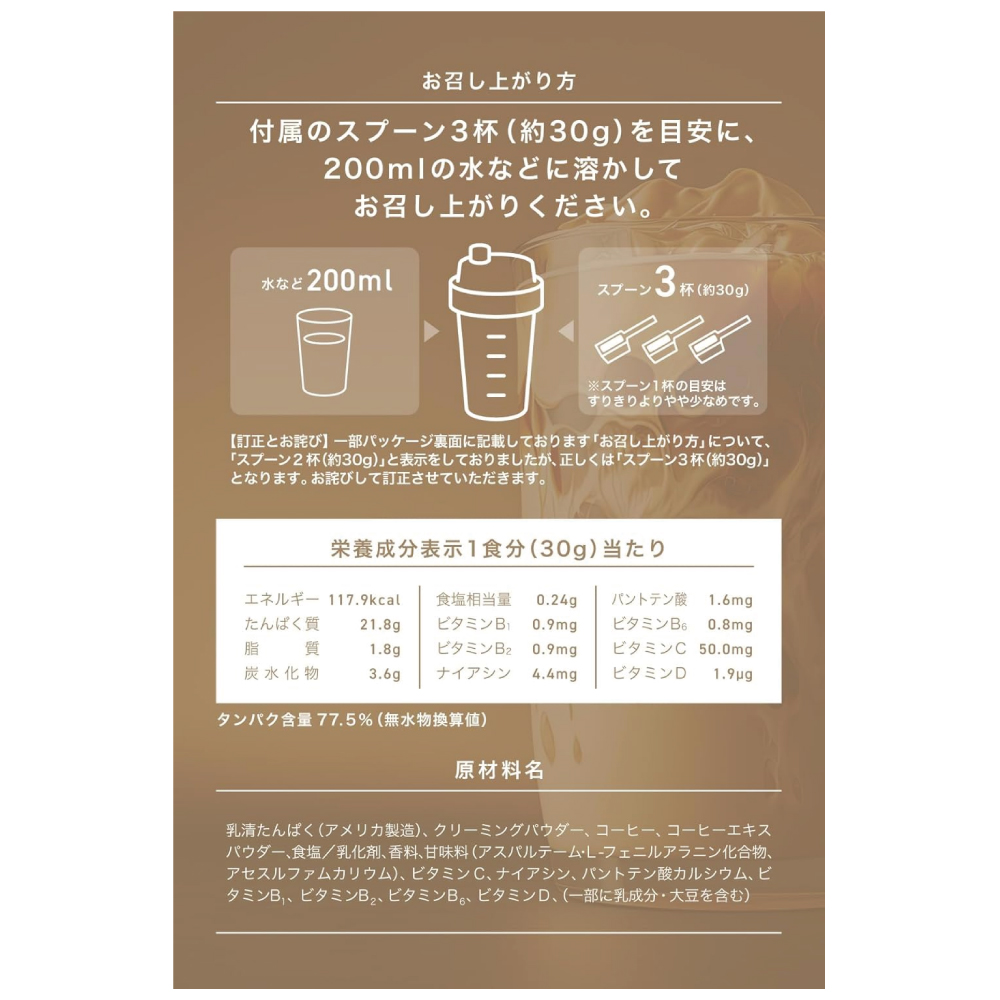 たんぱく原料として吸収スピードの速いホエイプロテインを100%使用。さらに毎日に欠かせない7種類のビタミン(V.B1,V.B2,V.B6,V.C,V.D,ナイアシン,パントテン酸)を配合。