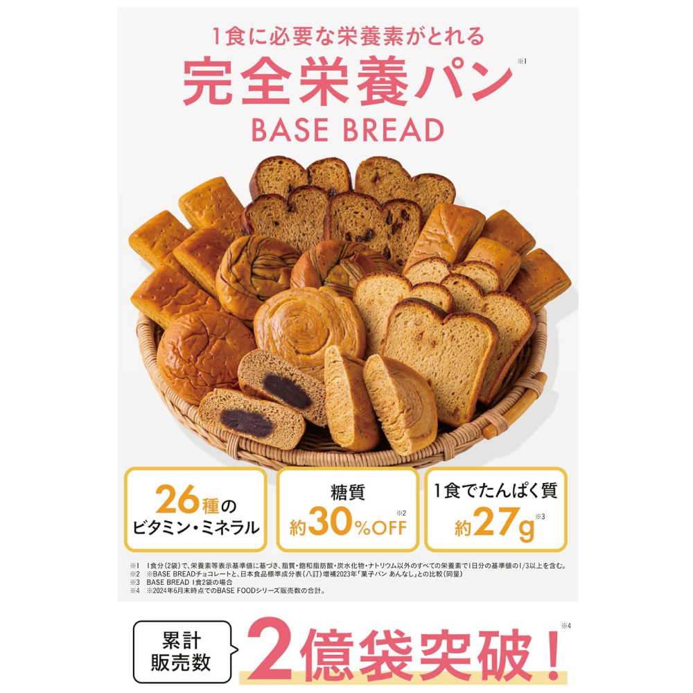 【BASE BREAD】1食2袋で1日に必要な栄養素の1/3をすべてとれる完全栄養食 ※1食で、栄養素等表示基準値に基づき、他の食事で過剰摂取が懸念される、脂質・飽和脂肪酸・炭水化物・ナトリウムを除いて、すべての栄養素で1日分の基準値の1/3以上を含む。