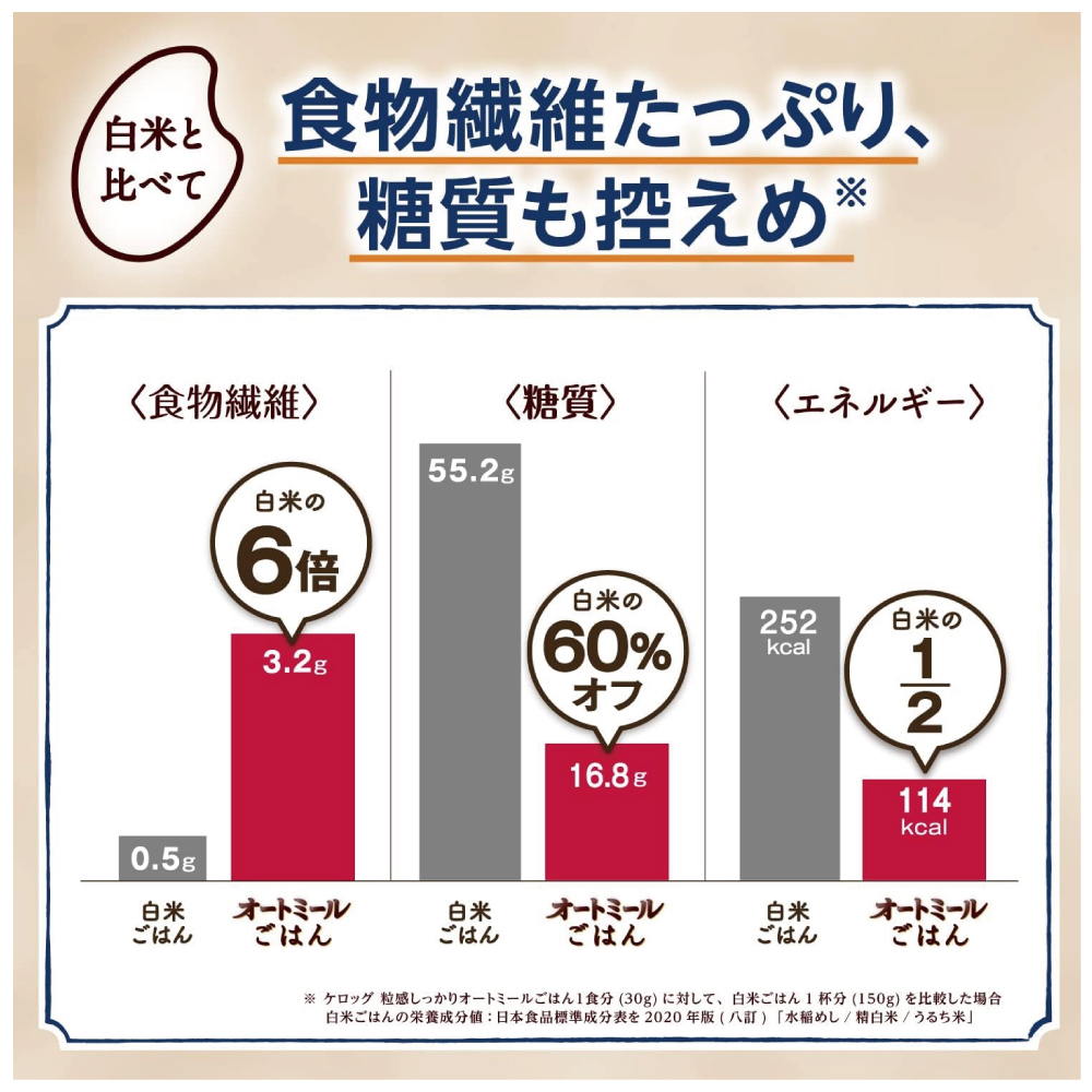 糖質60%オフ、食物繊維6倍*(*本品1食分30gに対して、白米ご飯1杯(150g)を比較した場合)