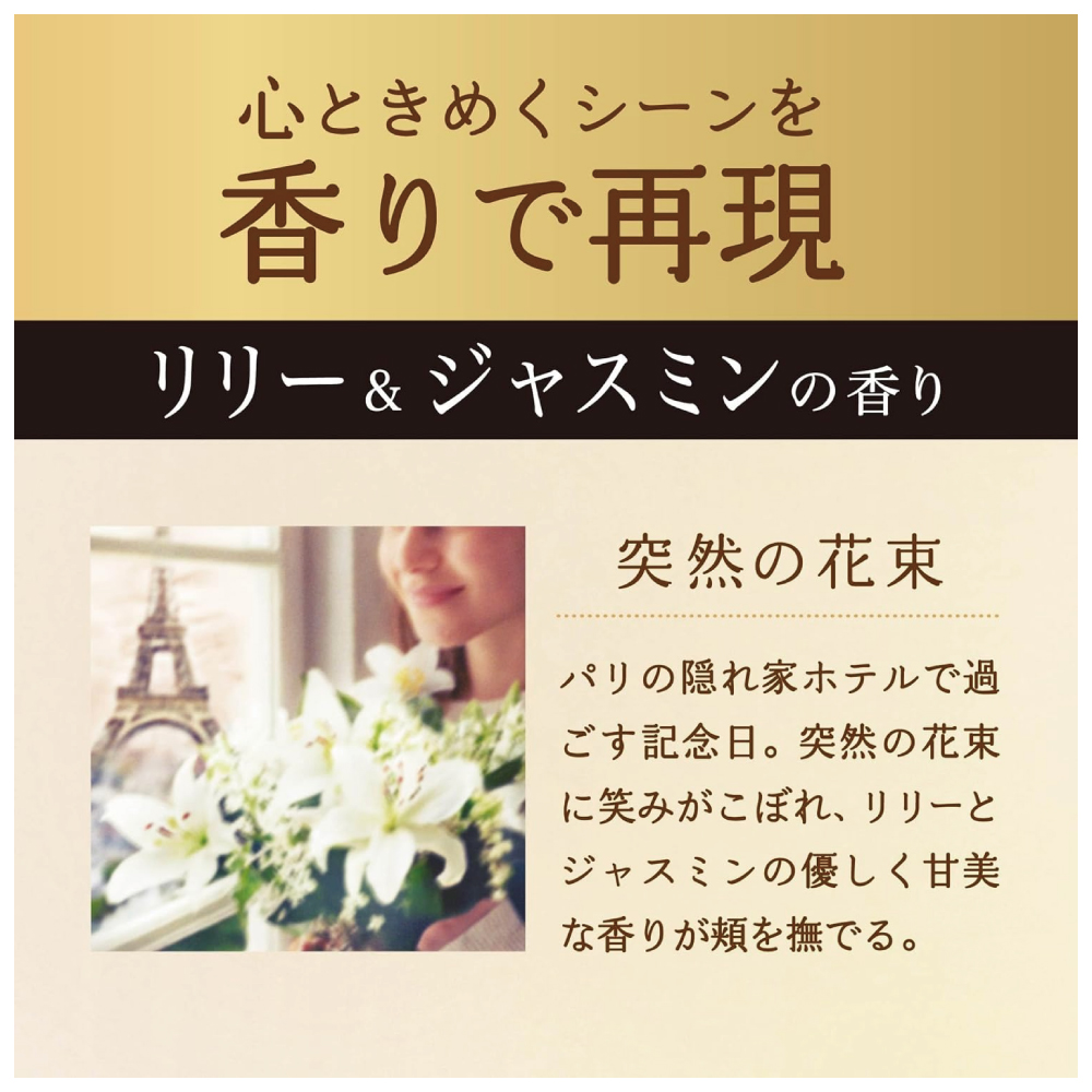 リリー&ジャスミンの香り。心ときめくシーンを香りで再現 突然の花束:パリの隠れ家ホテルで過ごす記念日。突然の花束に笑みがこぼれ、リリーとジャスミンの優しく甘美な香りが頬を撫でる。