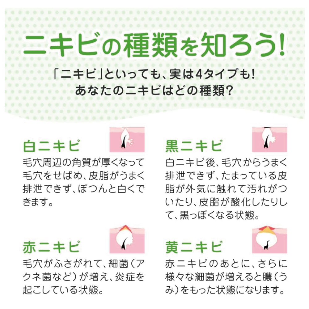 殺菌成分イソプロピルメチルフェノールと、抗炎症成分グリチルリチン酸ジカリウム配合で、ニキビのもとになるアクネ菌を毛穴の奥まで殺菌し、炎症を抑えてニキビを防ぎます。