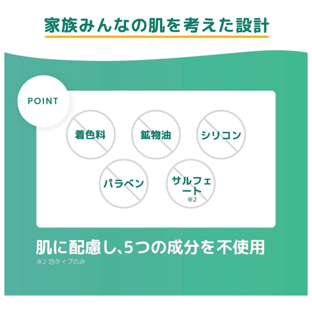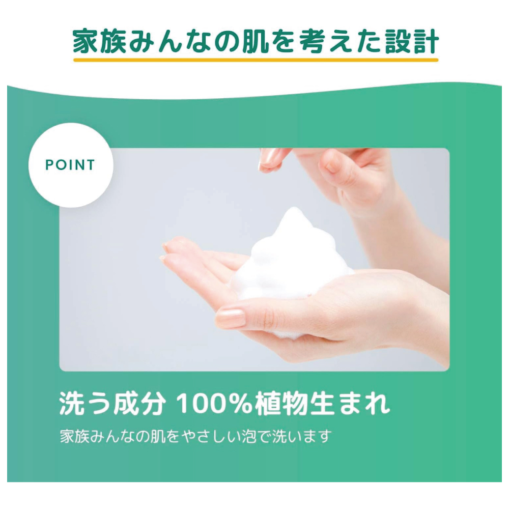【洗う成分100%植物生まれ】家族みんなの肌をやさしい泡で洗いあげます。モコモコの泡で洗えて、家族みんなの肌にちょうどいいサッパリ。