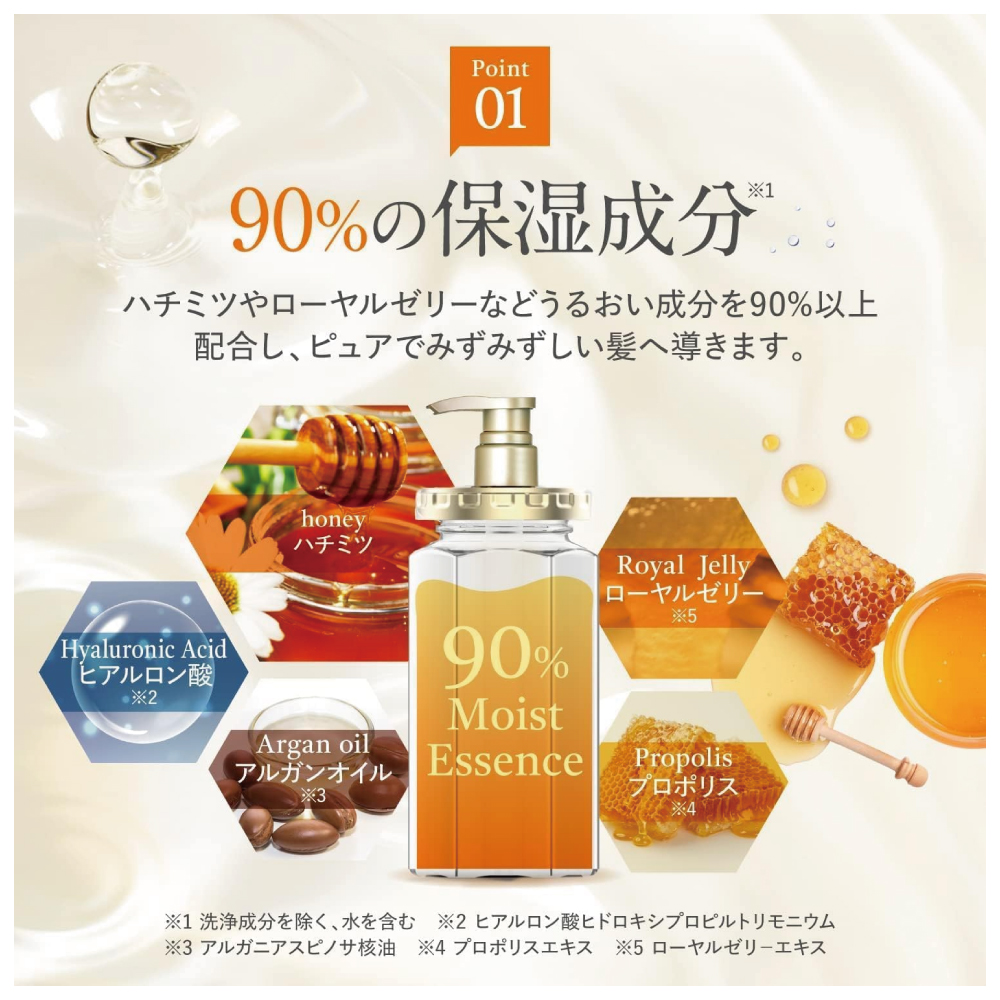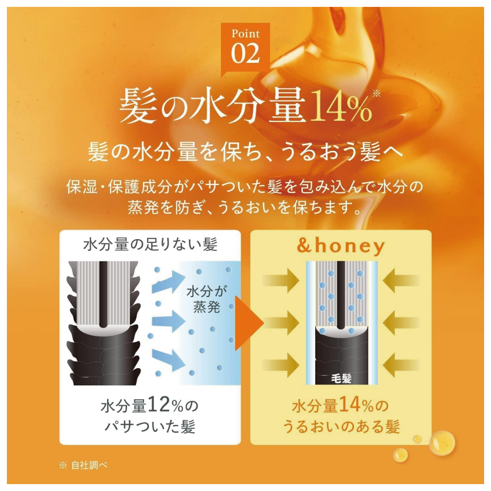 ダメージ補修で超しっとり髪へ(*1) (*1)当社従来品内(&honeyシリーズ内) (*2)ハチミツ(保湿)の配合濃度のこと(当社従来品比(&honey Creamyシリーズ比))