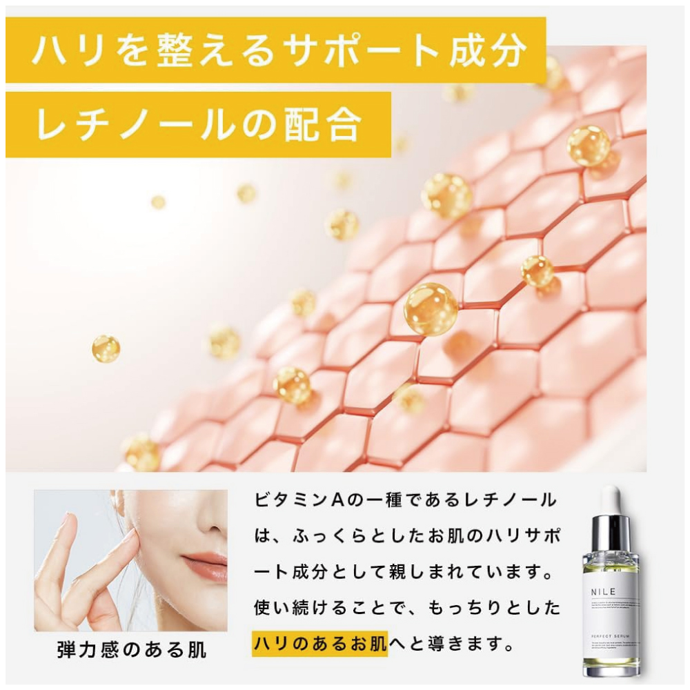 【濃厚な1滴】敏感肌・乾燥肌・荒れた肌・くすんだ肌・日焼け後の肌にハリと弾力をもたらす、NILEパーフェクトセラム。 豊富な美容成分をギュッと濃縮し1滴に込めた美容液です。