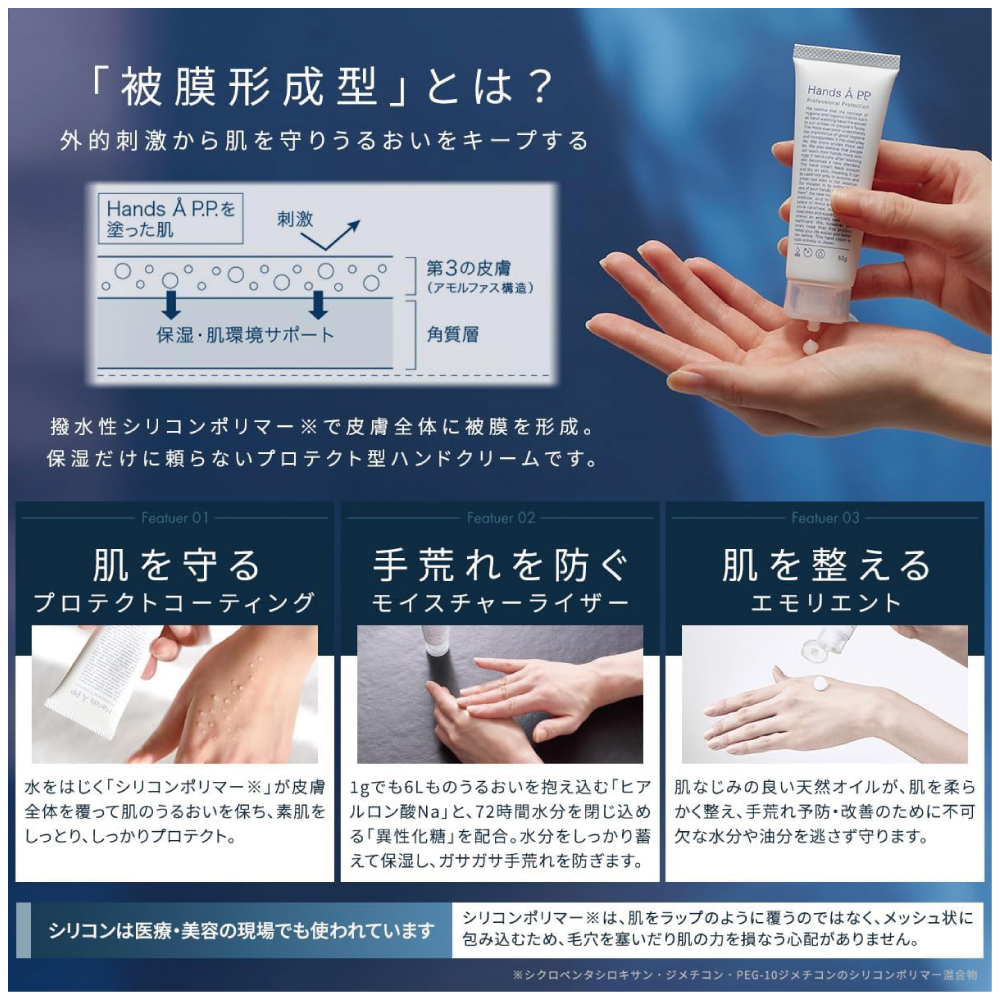 【被膜形成型クリーム Hands AP.P.】シミ・シワ・サメ肌もカバー。美しい自然な手腕へ導くオイルで整える被膜形成型クリーム植物エキス+9つのバランスオイル配合。手の甲から肩までの潤いを与えて美しく。