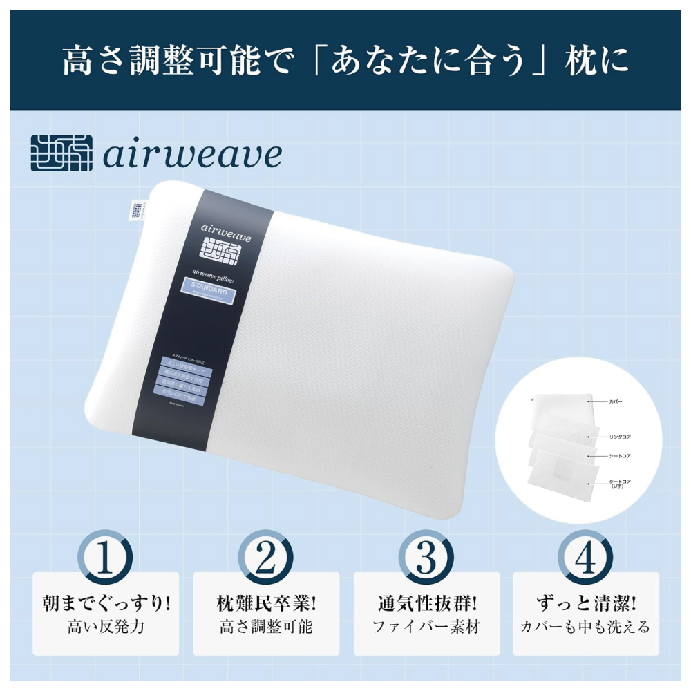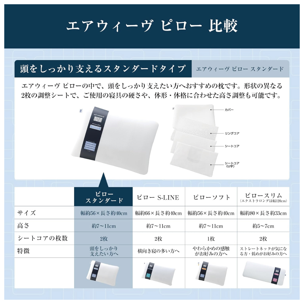 ・枕は、体幹(頭から背骨のライン)がまっすぐになるよう高さの調整が非常に重要です。エアウィーヴ ピロー スタンダードは、形状の異なる2枚の調整シートが付属し、 ご使用になっている寝具の硬さや、体形・体格に対応できる構造になっています。