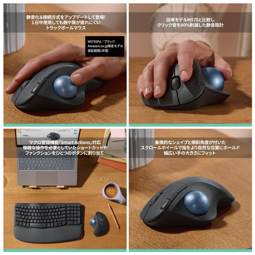 ・従来モデルM575と比較しクリック音を80%削減した静音トラックボールマウス