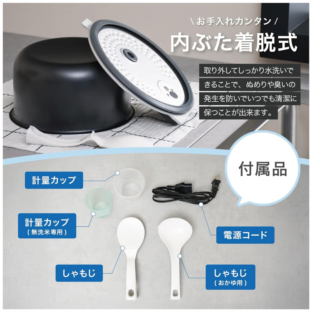付属品:計量カップ(白米/無洗米用)、しゃもじ、しゃもじ(おかゆ用)、電源コード