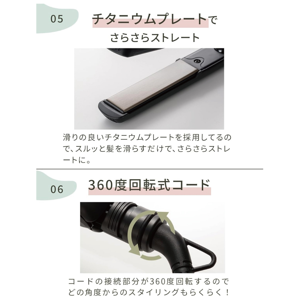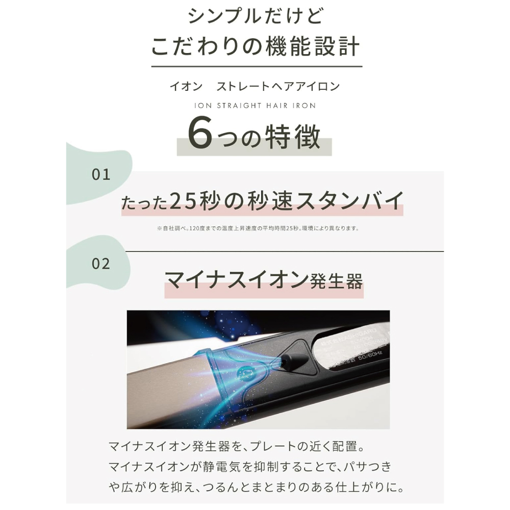 【マイナスイオン発生器搭載】マイナスイオン発生器を搭載しているので、髪のダメージを抑えながら ストレートスタイルにすることができる 髪が痛みくいコテアイロンです。痛まないヘアアイロンをお探しの方に◎