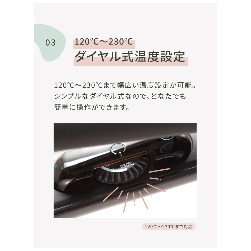 【ダイヤル式温度設定】120℃~230℃までダイヤル式で設定が可能。簡単操作で初心者の方にも◎スピードヒーター搭載で忙しい朝でもあっという間に使用可能温度に到達します。 サロン用としてプロの美容師さんにも人気です。