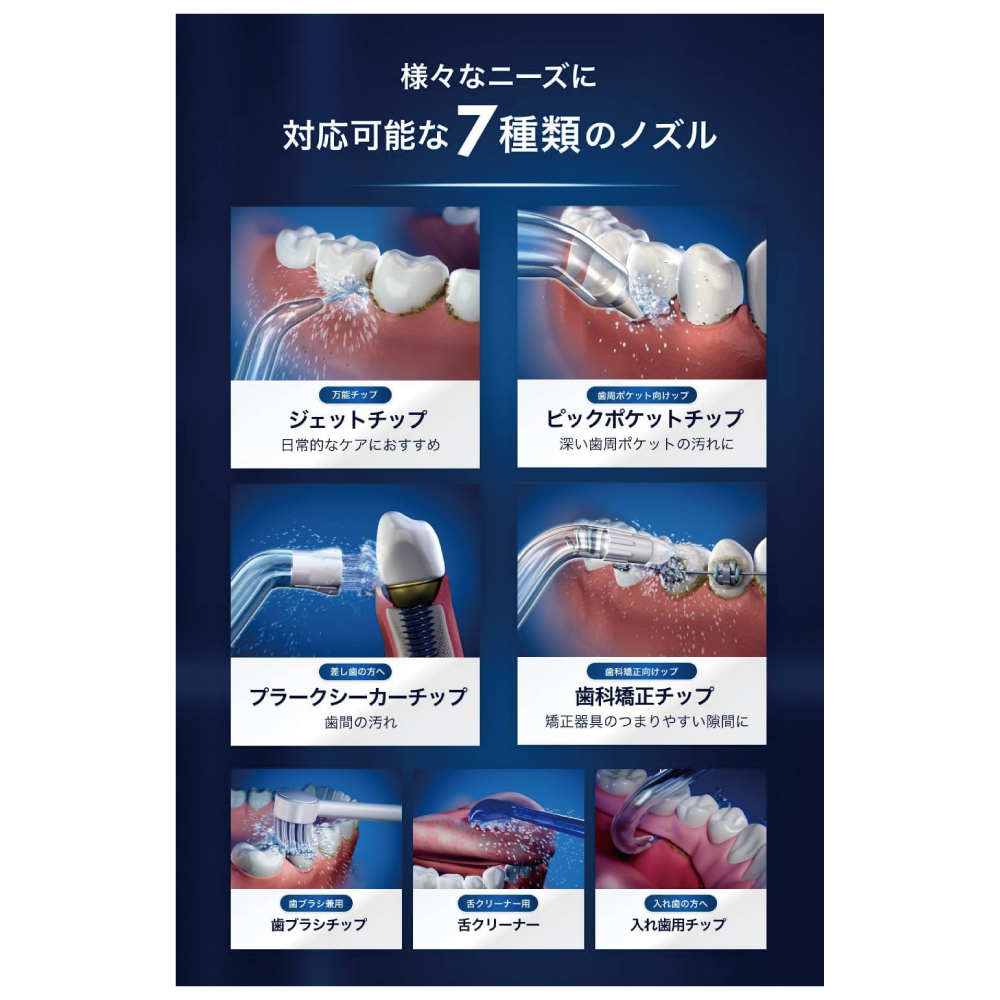 ▼付属品(ホワイト) 1. 新モデル (コードレスエンハンス):ジェットチップ×1、舌クリーナーチップ×1 2. プロモデル (コードレスセレクト):ジェットチップ×2、舌クリーナーチップ×1 3. 桃さん特別セット :ジェットチップ×1、プラークシーカーチップ×2、舌クリーナーチップ×1、TheBreathCo Mild Mint500ml×1
