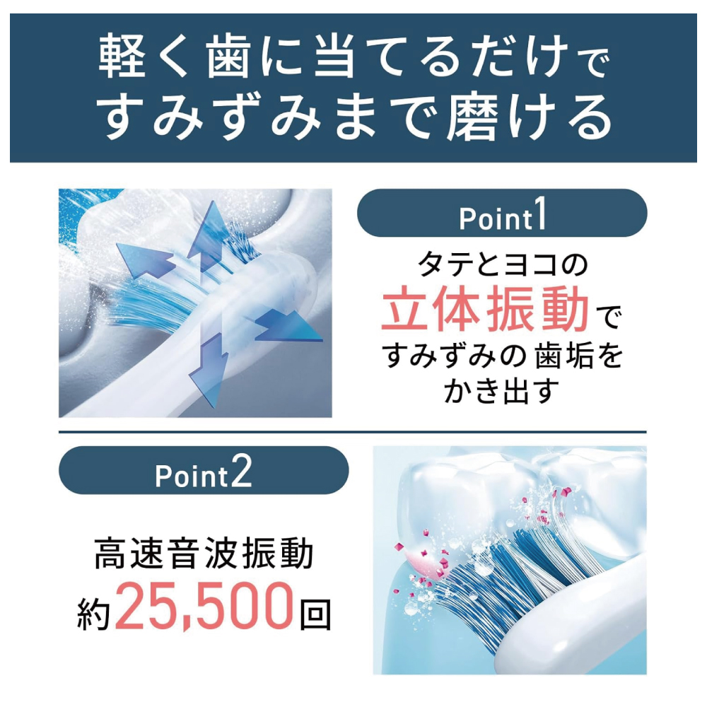 歯の表面だけでなく、歯のすき間や凹凸に毛先が入り込み、歯垢を効果的に除去します。 毛先が楕円運動をおこなうクリーンモードを搭載 最大25,500回/分の高速音波振動で歯垢をかき出す。 歯の表面だけでなく、歯のすき間や凹凸に毛先が入り込み、歯垢を効果的に除去します。