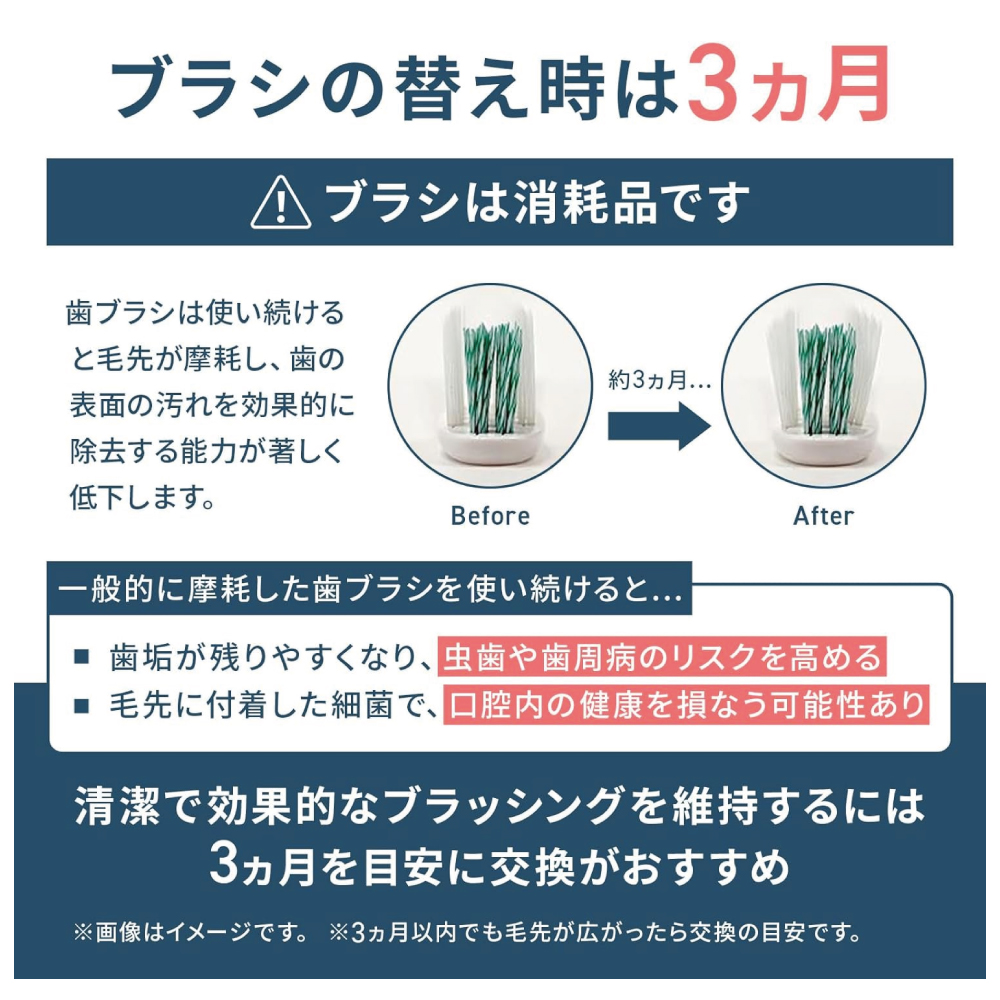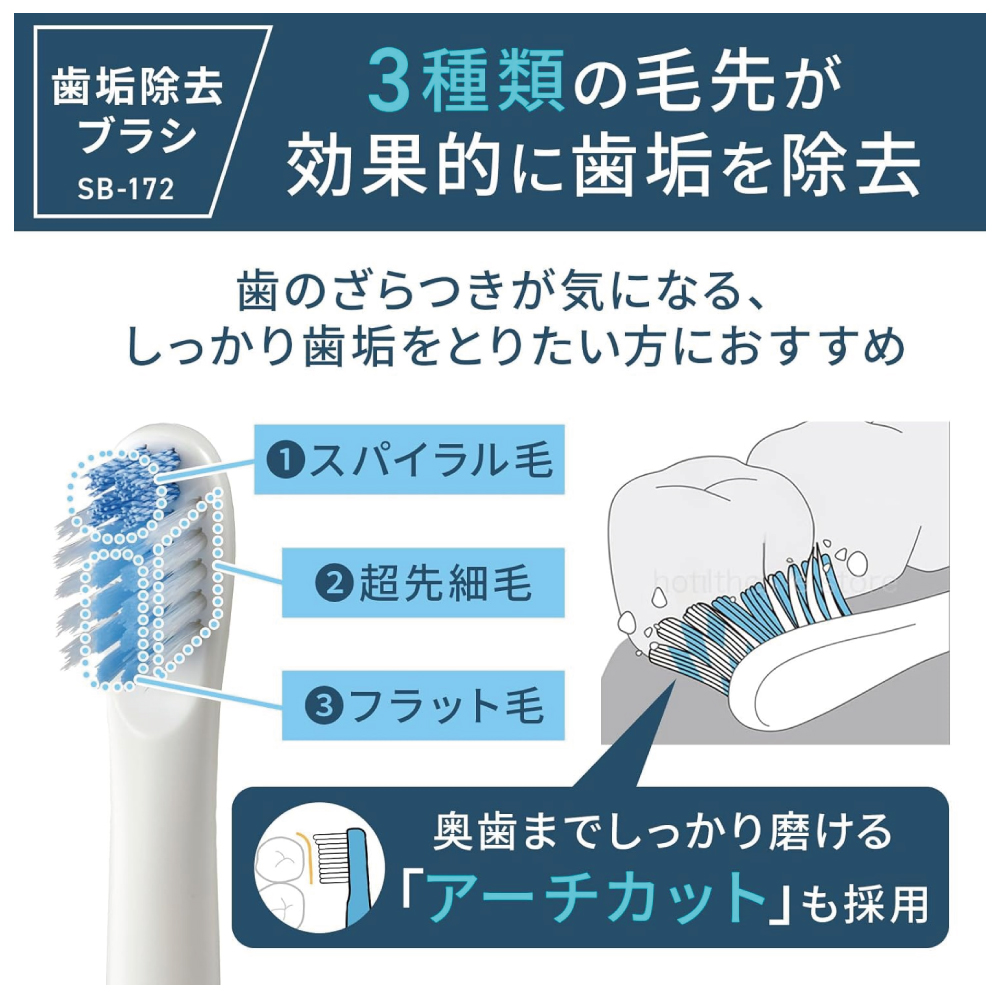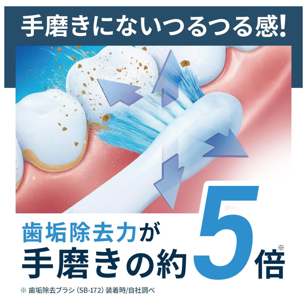 ・付属品:歯垢除去ブラシ、歯周ケアブラシ(各1本)、ブラシスタンド、充電器、取扱説明書(品質保証書付き)