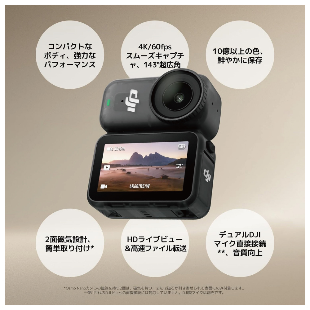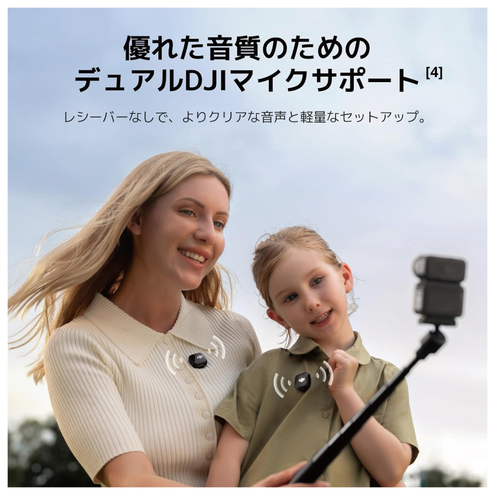・クリアな音声を即座に - Osmo Nanoは2つのマイク[4]への直接接続をサポートし、Vlogにオリジナルで高品質な音を提供します。どこでも没入感のあるオーディオとプロレベルの結果を楽しめます。