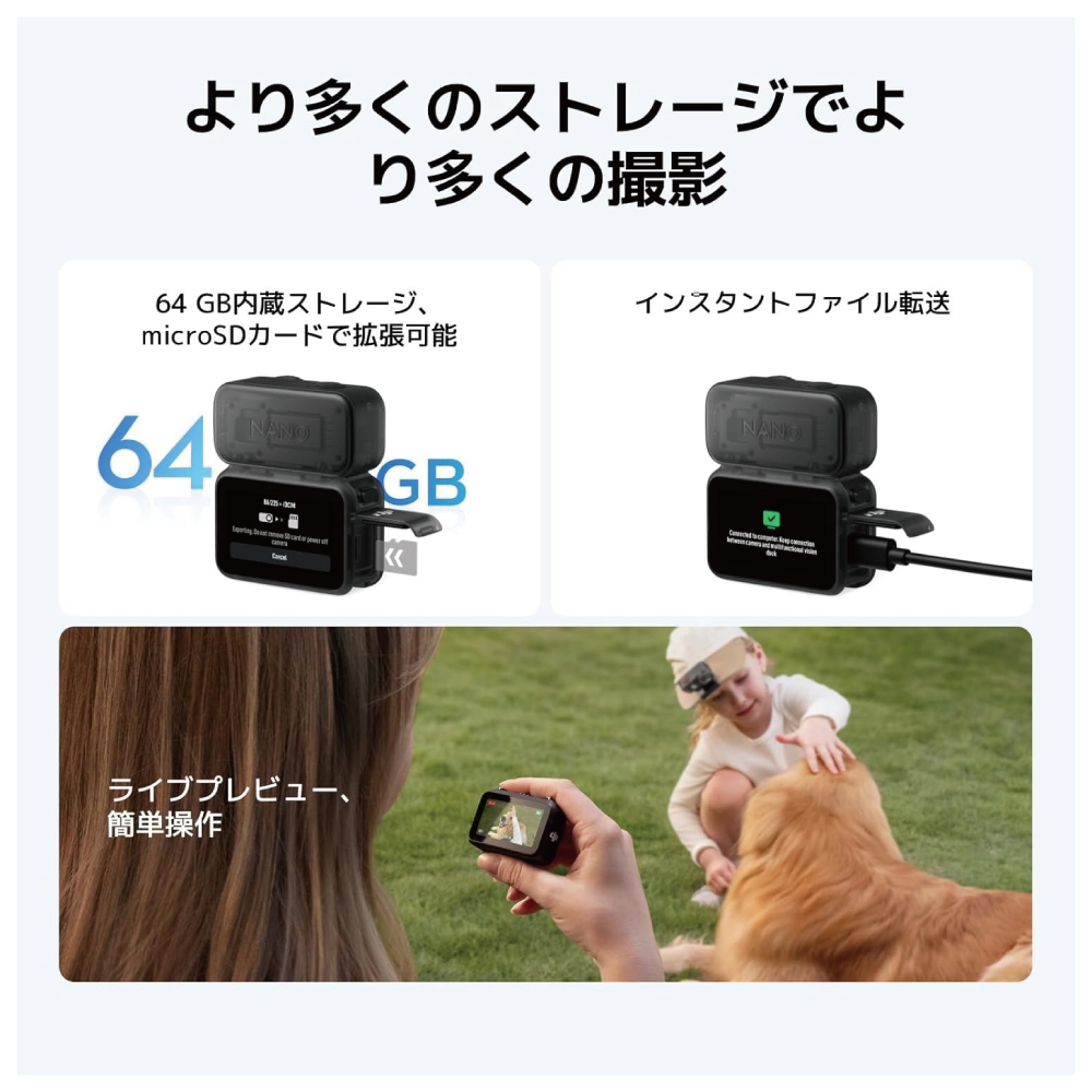 ・超広角4K高画質 - 4K/60fpsで、143°の超広角ビューであらゆる瞬間を録画できます。小型アクションカメラや、没入感のあるペットPOV、Vlogにも最適です。