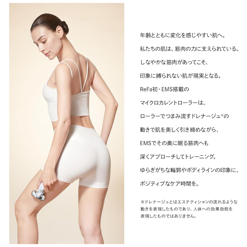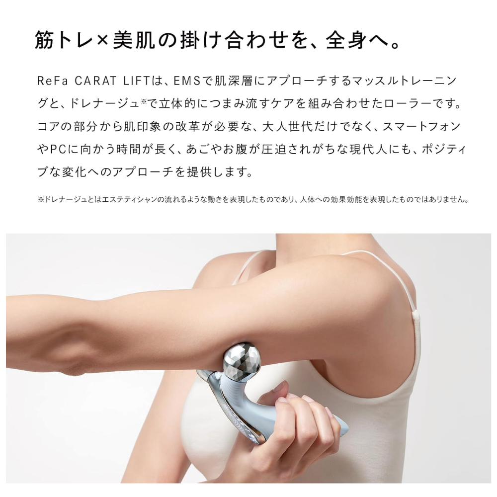 【筋トレ×美肌の掛け合わせを、全身へ。】 ReFa CARAT LIFTは、EMSで肌深層にアプローチするマッスルトレーニングと、ドレナージュ※で立体的につまみ流すケアを組み合わせたローラーです。コアの部分から肌印象の改革が必要な、大人世代だけでなく、スマートフォンやPCに向かう時間が長く、あごやおなかが圧迫されがちな現代人にも、ポジティブな変化へのアプローチを提供します。