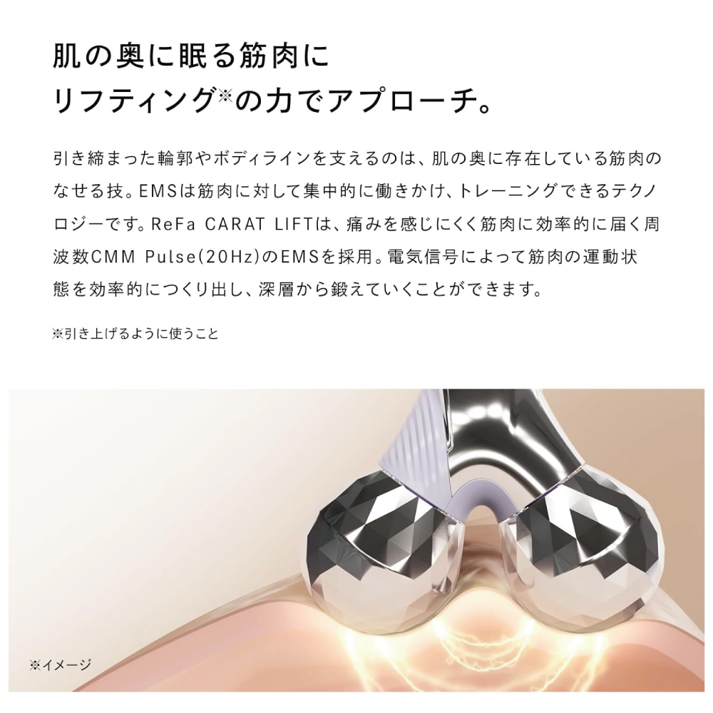 【肌の奥に眠る筋肉にリフティング※の力でアプローチ】 引き締まった輪郭やボディラインを支えるのは、肌の奥に存在している筋肉のなせる技。EMSは筋肉に対して集中的に働きかけ、トレーニングができるテクノロジーです。ReFa CARAT LIFTは、痛みを感じにくく筋肉に効率的に届く周波数CMM Pulse(20Hz)のEMSを採用。電気信号によって筋肉の運動状態を効率的につくりだし、深層から鍛えていくことができます。