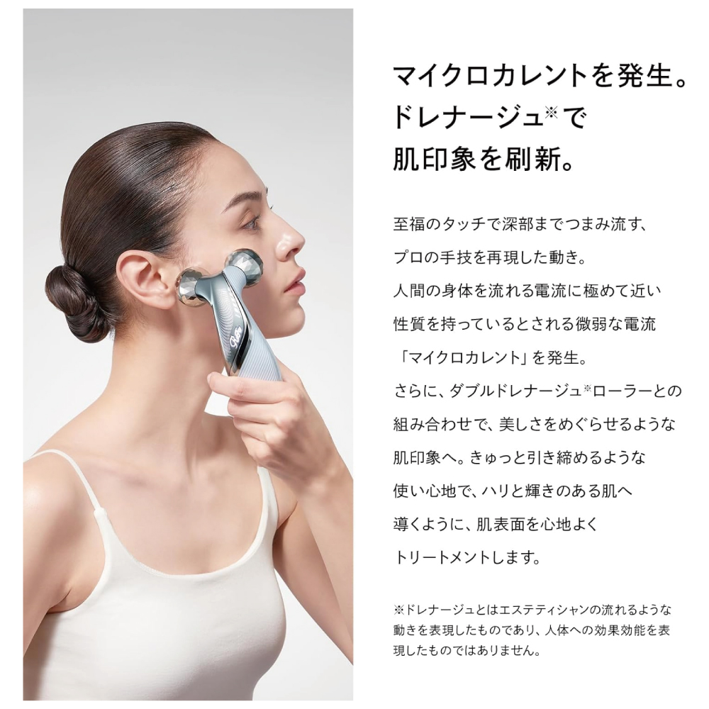 【マイクロカレントを発生。ドレナージュ※で肌印象を刷新。】 至福のタッチで深部までつまみ流す、プロの手技を再現した動き。人間の身体を流れる電流に極めて近い性質を持っているとされる微弱な電流「マイクロカレント」を発生。さらに、ダブルドレナージュ※ローラーとの組み合わせで、美しさをめぐらせるような肌印象へ。きゅっと引き締めるような使い心地で、ハリと輝きのある肌へ導くように、肌表面を心地よくトリートメントします。