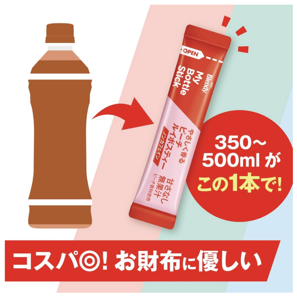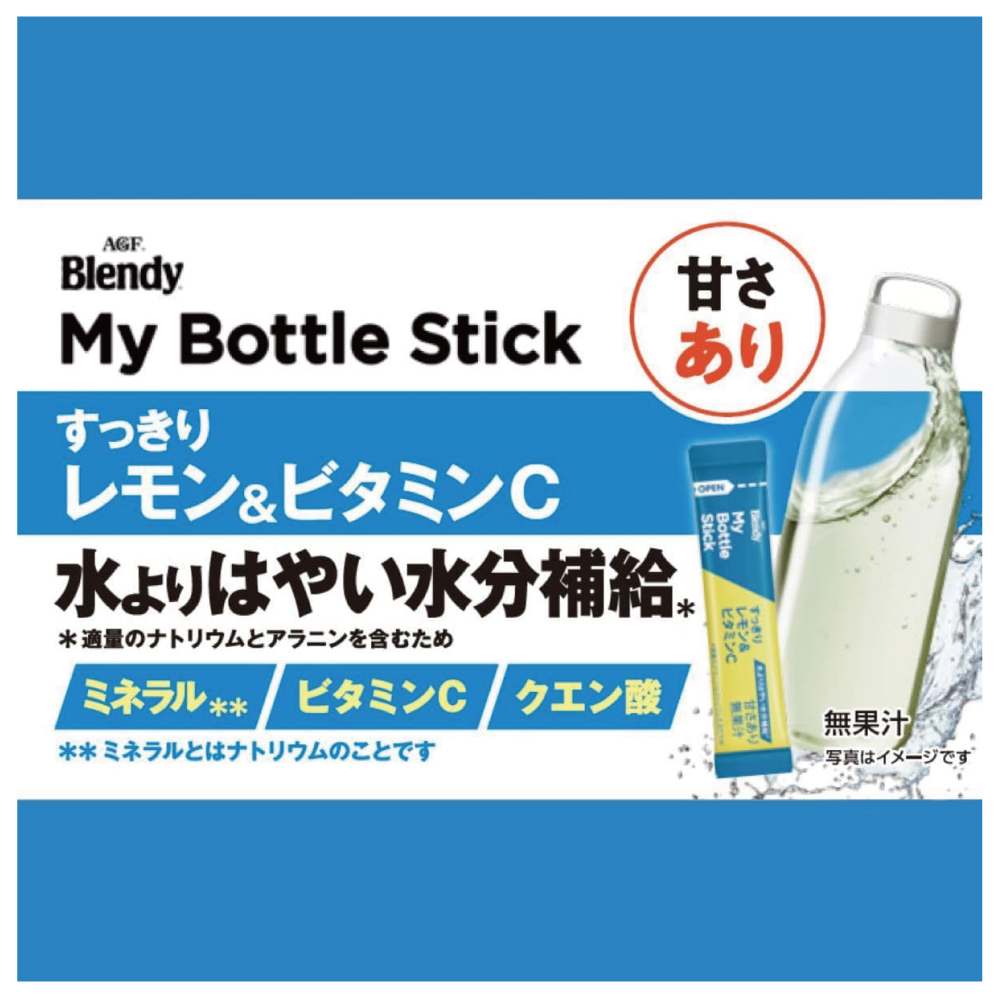 「Blendy(ブレンディ)」 マイボトルスティックは、水またはお湯にスティックを1本入れて振るだけで1日を楽しめるマイボトルサイズのパウダードリンクです。スティック1本で350ml~500mlのマイボトル1本分。