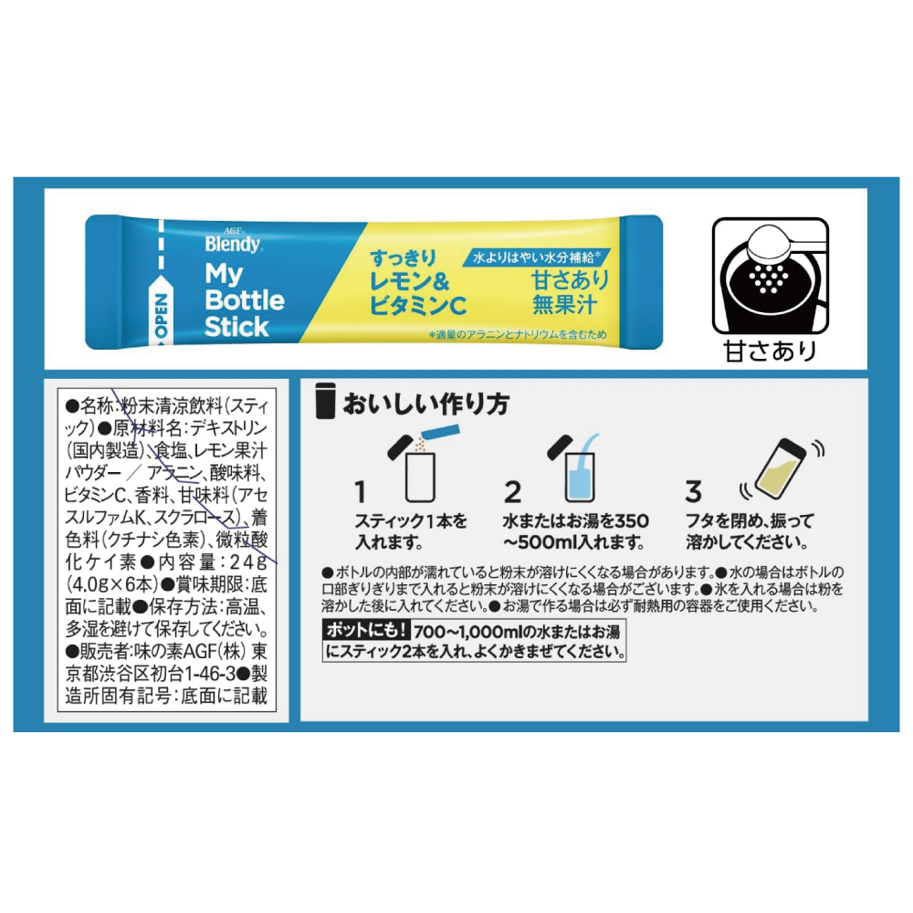 AGF(エージーエフ) 「ブレンディ」 マイボトルスティック すっきりレモン&ビタミンC 6本は、マイボトルに最適なレシピで水とまぜればすぐできるパウダータイプのレモン水です。