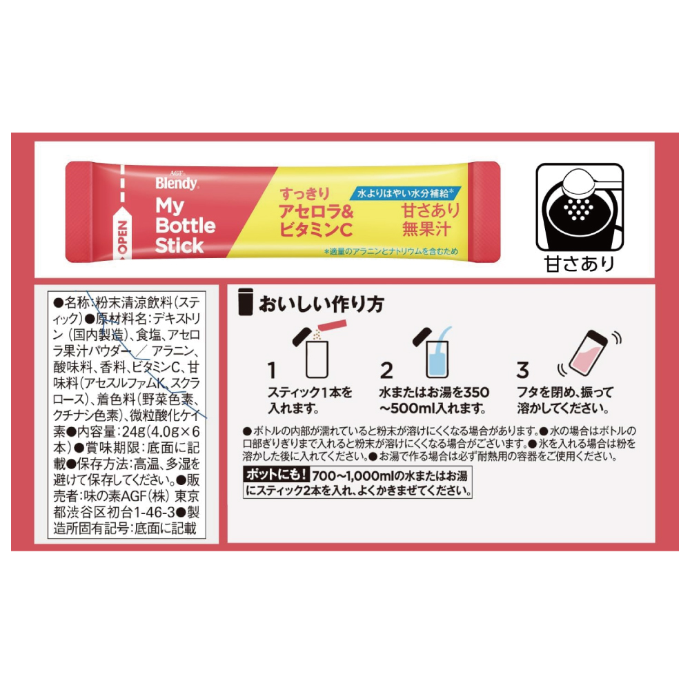 AGF(エージーエフ) 「ブレンディ」 マイボトルスティック すっきりアセロラ&ビタミンC 6本は、マイボトルに最適なレシピで水とまぜればすぐできる、パウダータイプのアセロラドリンクです。