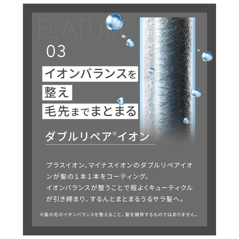 【2つのイオン】プラスイオン、マイナスイオンが髪の1本1本をコーティング。イオンバランスを整えキューティクルを引き締める。