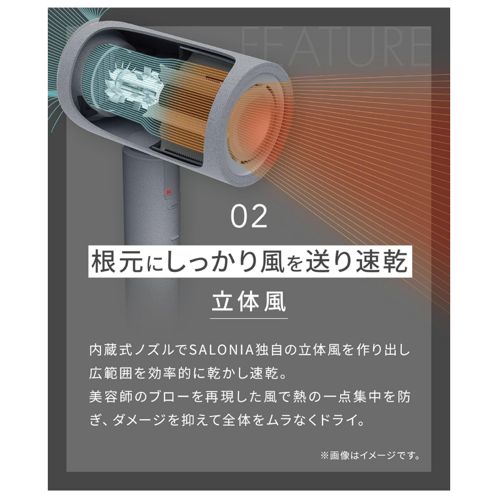 【立体風】内臓式ノズルでSALONIA独自の立体風を作り出し広範囲を効率的に乾かし速乾。