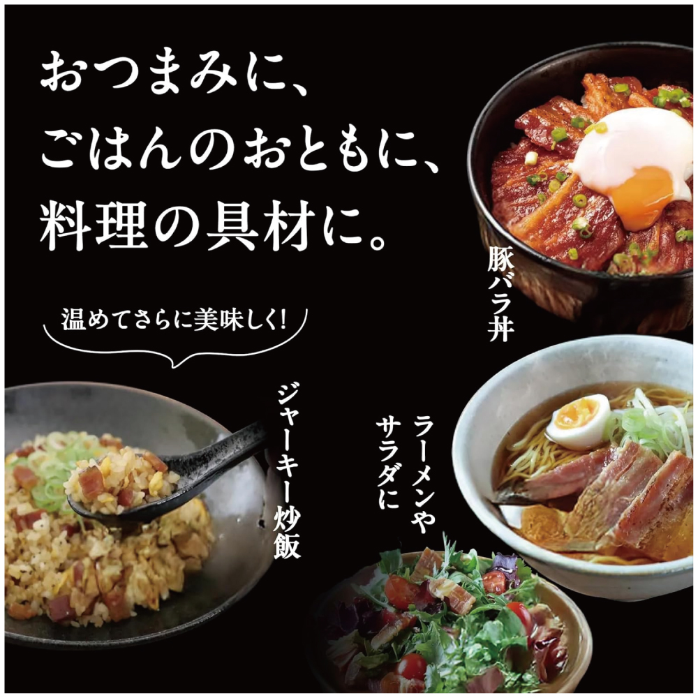 【ジャーキーの常識を超えるアレンジ力】そのままでも美味しい豚バラジャーキーですが、温めると一層香り立ち、料理の具材としても活躍。主役級の存在感でご飯にのせれば香ばしい豚バラ肉の丼に。炒め野菜と合わせて晩ごはんの一品、おつまみ、お弁当にも。アレンジ自在で、楽しみ方が広がるポークジャーキーです。