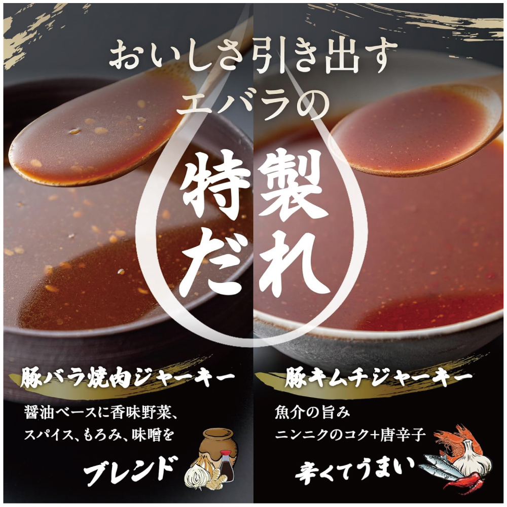 【エバラ秘伝のタレが決め手】濃口の焼肉のタレに香味野菜やスパイスを重ね、後引く旨さを演出した「焼肉風味」、魚介の旨味や唐辛子の辛味が融合した「キムチ風味」。2タイプの異なるポークジャーキーをお楽しみいただけます。