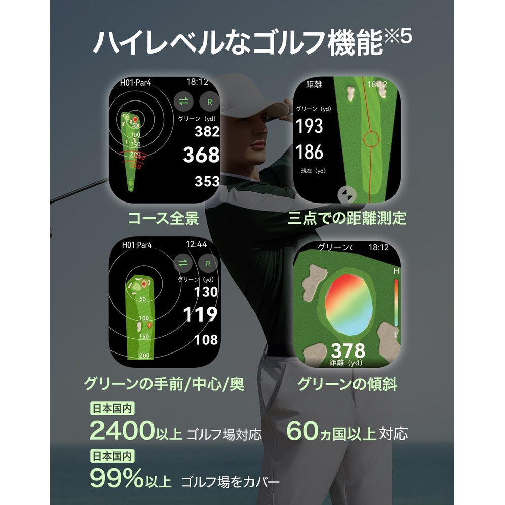 【ゴルフナビ、登山、トレランなど豊富なワークアウト】パワフルなゴルフナビ機能、登山、トレイルランニング、約40mフリーダイビングなど、100種類以上のアクティビティを見つけ、楽しむことができます。また、新たに搭載された気圧計によりハイレベルな測定も可能です。