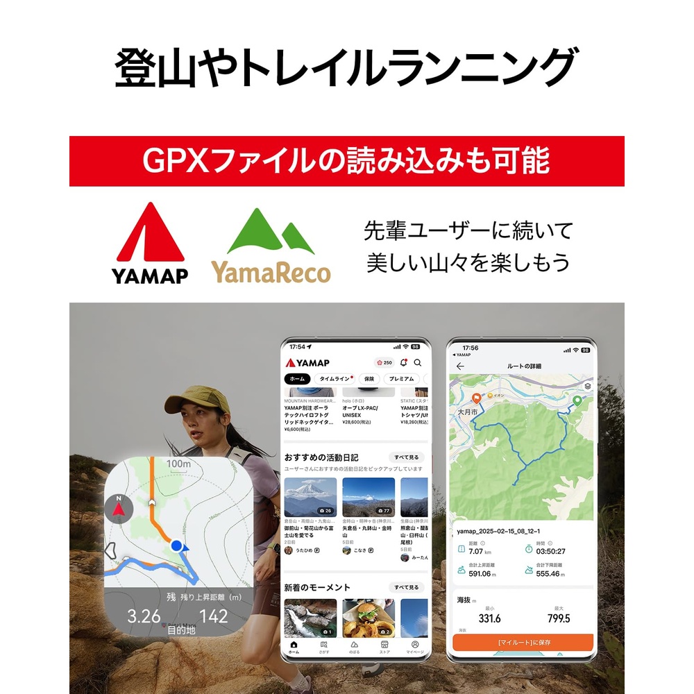 【手首に付ける登山ガイド】YamapやYamaRacoのルートインポートに対応し、GPX(GPS Exchange Format)ファイルの読み込みも可能になりました。GPSデータのやり取りが可能になり、等高線マップのフルカラー表示や、登山中の豊富なデータ表示で、より便利に、より快適な登山体験が得られます。