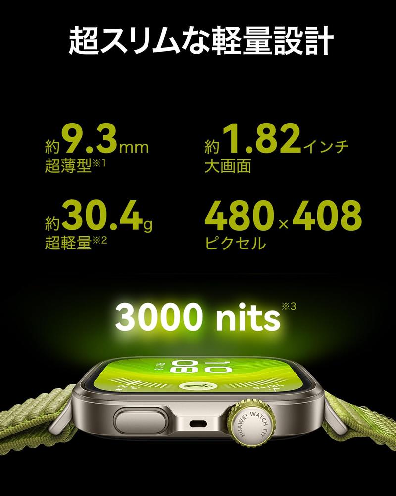 【薄型軽量で頑丈なボディ、アップグレードしたディスプレイ】厚さ約9.3mm、重さわずか約30.4g。スリムなボディに、超強力なチタン合金ベゼルと航空機グレードのアルミニウム合金を採用、1.82インチのディスプレイはサファイアガラスで頑丈にカバーされ、3000nitsの明るさはアウトドアでも鮮明に見えます。