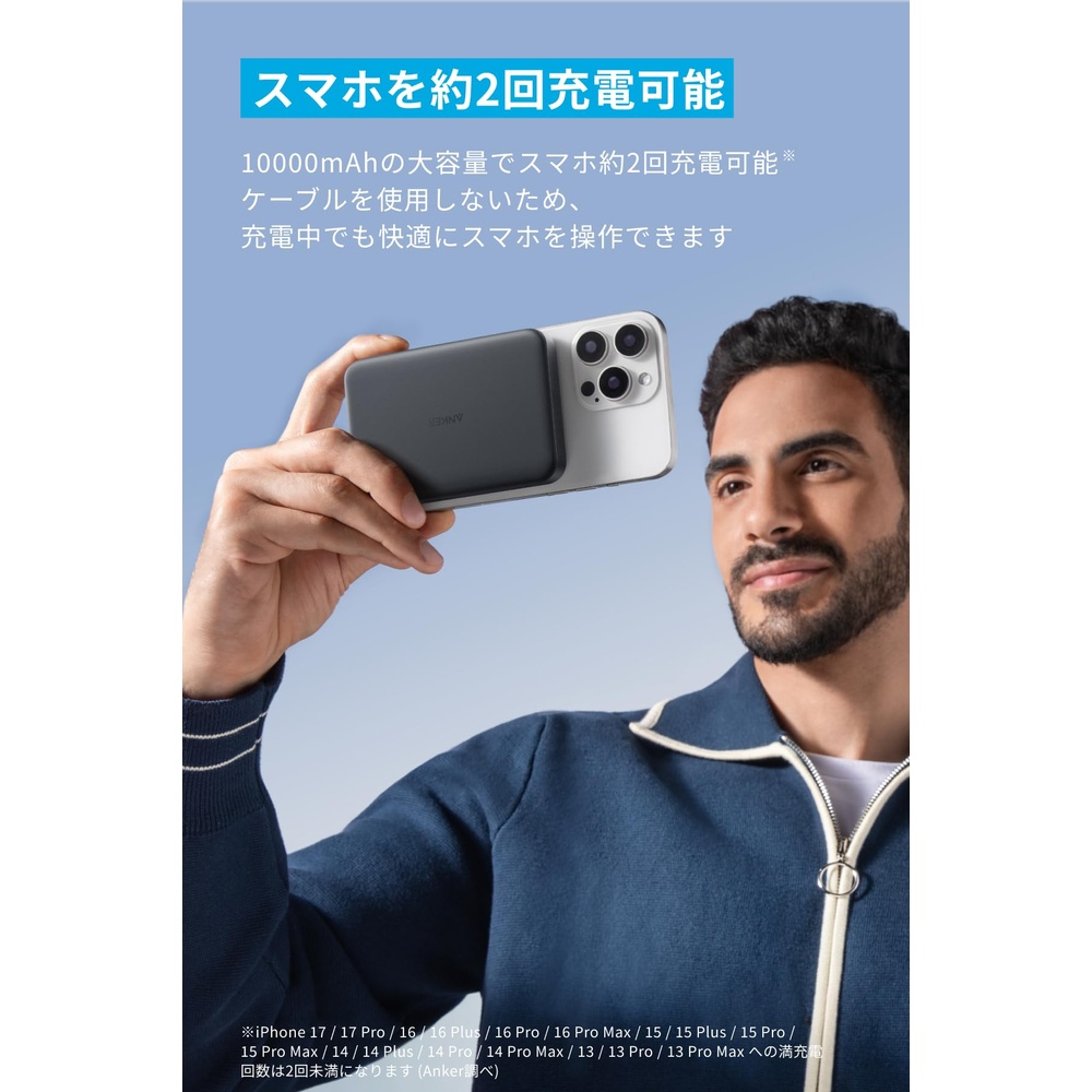 スマホを約2回充電可能:10000mAhの大容量でスマホ約2回充電可能。ケーブルを使用しないため、充電中でも快適にスマホを操作できます。