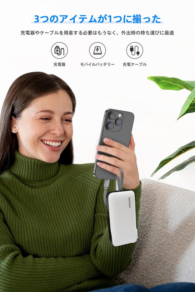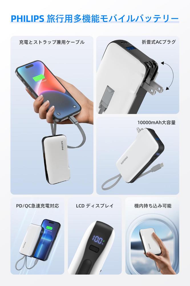 Philips(フィリップス) モバイルバッテリー コンセント一体型 10000mAh ACプラグ付き 大容量 携帯充電器 PD 20W出力 3台同時充電