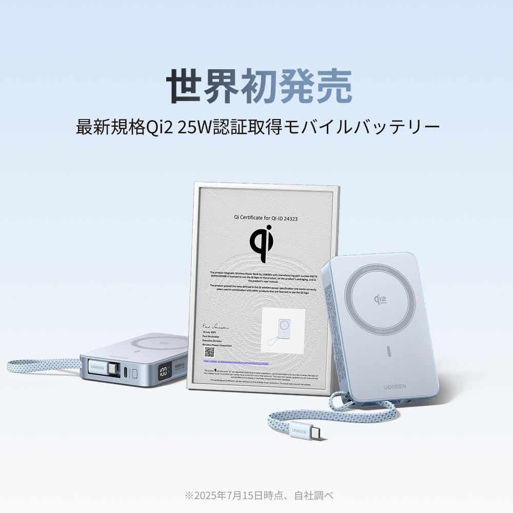 【 ★ 世界初販売 Qi2 25W ★ 】UGREENが業界で初めて実現した【Qi2対応・25W】ワイヤレス急速充電を搭載したモバイルバッテリーです。従来にはなかった先進技術により、マグネット自動吸着で位置ズレを防ぎ、これまでにない短時間で効率的な充電体験を提供します。さらに内蔵Type-Cケーブルは最大30Wの有線急速充電(双方向)に対応し、スマホ・タブレット・イヤホンを外出先でもスマートに補えます。