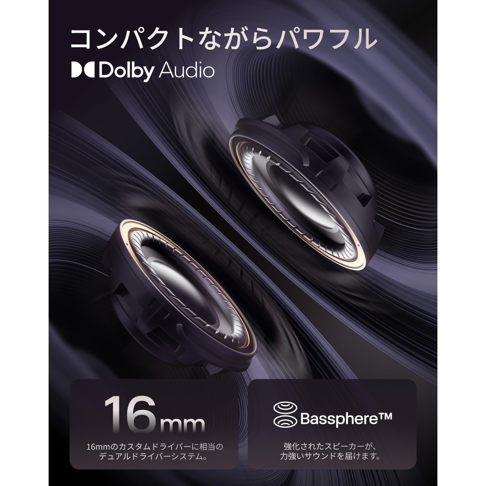 Dolby Audio搭載・臨場感あふれる高音質:16mm相当のデュアルドライバーシステムとShokz独自の「Bassphere」テクノロジーにより強化されたスピーカーは、「OpenBass 2.0」技術と連携し、オープンイヤー型でも力強く深みのある低音から繊細な高音まで忠実に再現します。映画館にもよく使れている「ドルビーオーディオ」に対応し、まるでライブのような臨場感を味わえます。