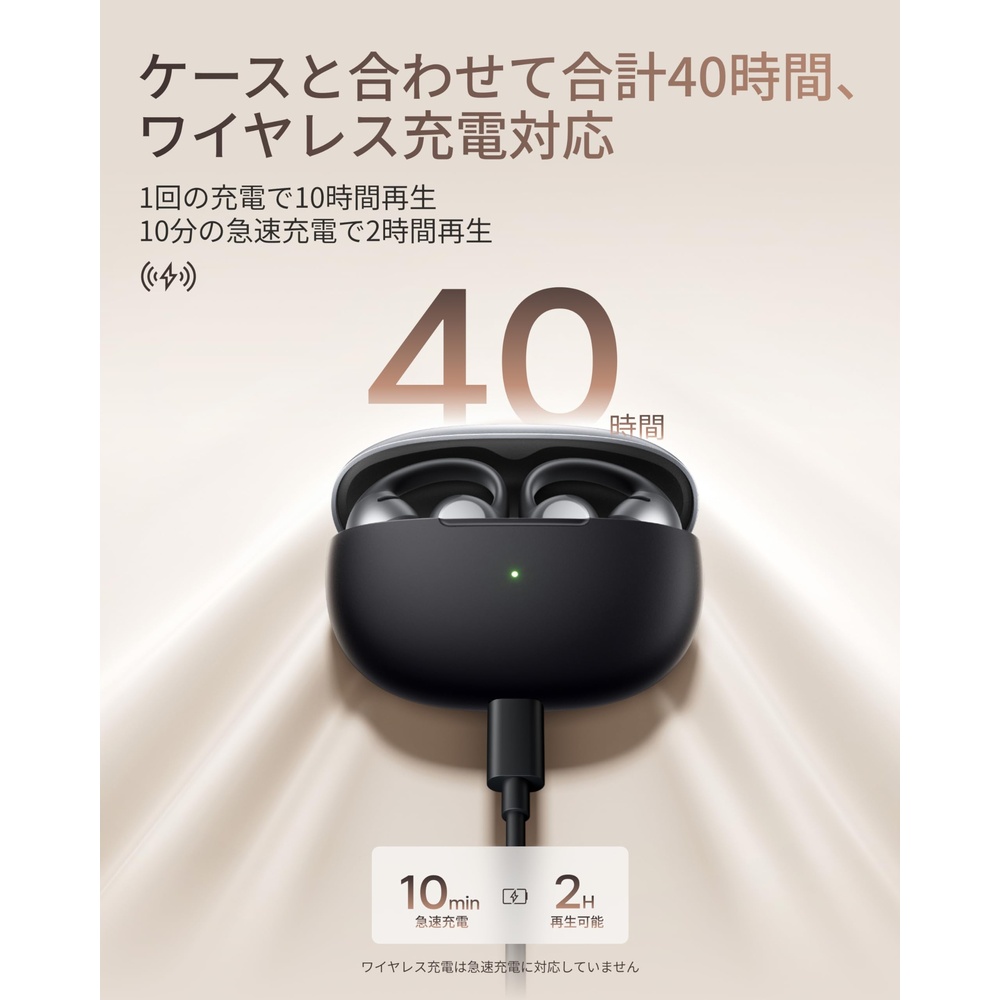最大40時間再生・ワイヤレス充電対応:10分の急速充電で約2時間、フル充電ならイヤホン本体で最大10時間連続、ケース併用で最大40時間再生可能なスタミナを実現。ワイヤレス充電対応のポケットサイズ充電ケースで外出時もらくらく。バッテリー切れの心配なく、時間を気にせず、心ゆくまでお楽しみいただけます。