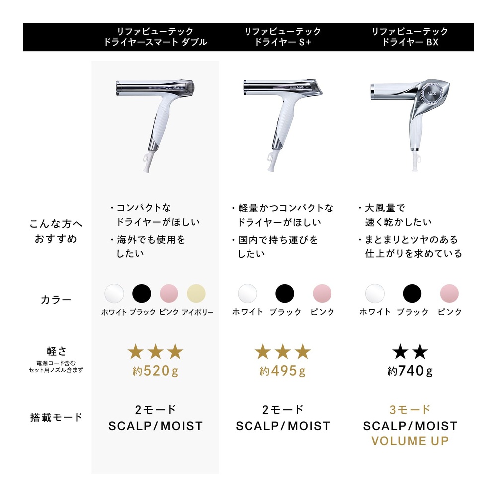 【コンパクトなのに、パワフル。ツヤめき、まとまる仕上がりを、海外でも】速乾※、そして仕上がりの美しさのすべてを同時に叶えるヘアドライヤー。コンパクトなボディから生まれるパワフルな風で、ツヤめきと、美しいまとまりを叶えます。海外でも使えるマルチボルテージ仕様だから理想のスタイルを、旅行先や出張先でも。独自のテクノロジーとメソッドで、いつものヘアドライをもっと美しくなれる時間へ。※当社従来品2021年発売ReFa BEAUTECH DRYER PROとの比較(当社調べ)