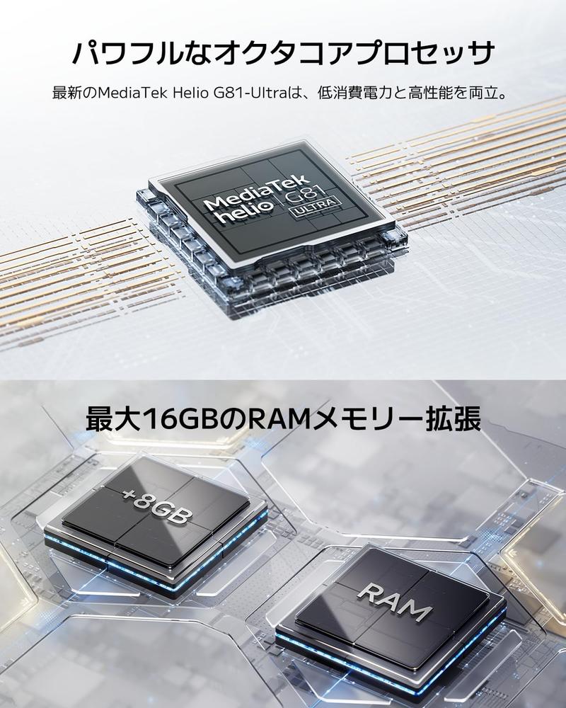【強力なオクタコアプロセッサ】最新のMediaTek Helio G81-Ultraは、低消費電力と高性能を両立。その卓越した性能により、バッテリーの長持ち、動作のなめらかさ、そして比類のないユーザーエクスペリエンスを実現します。