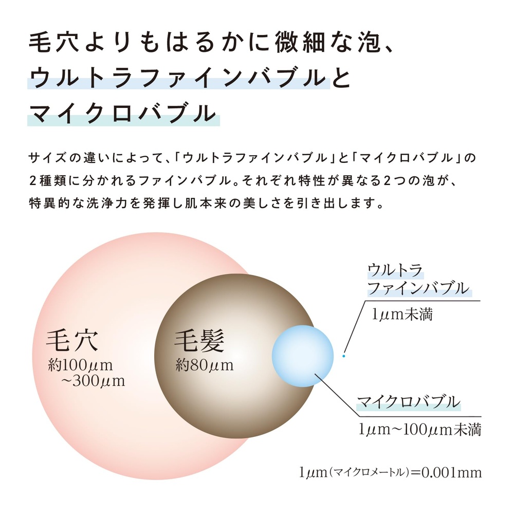 【ダブルの洗浄力で落とす】ウルトラファインバブルが毛穴の奥まで入り込んで汚れを取りのぞき、マイクロバブルが毛穴につまった大きな汚れを浮かせて取りのぞきます。