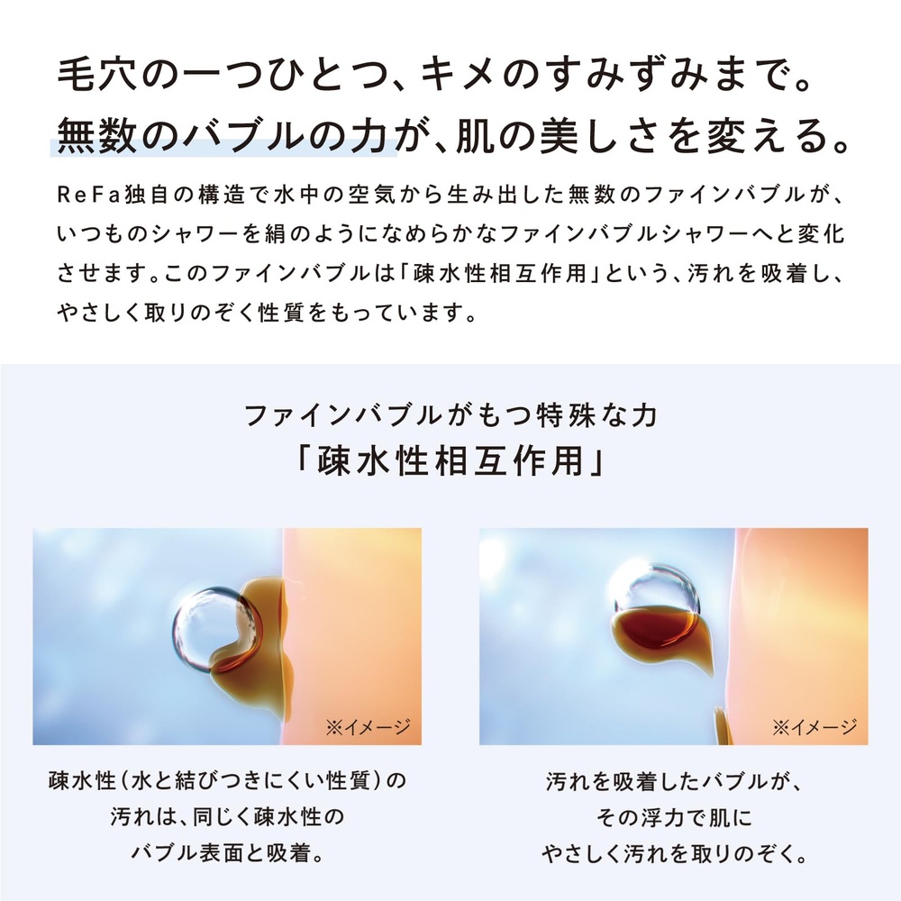 【美しさを引き出す泡で、肌と髪に磨きをかける】毎日浴びる水には、こだわりたい。 バスタイム中にふれつづける水に着目したReFaから、敏感な肌のことを考え抜いたシャワーヘッド、ReFa FINE BUBBLE PUREが誕生しました。 浴びるたび、肌や髪の美しさに磨きがかかります。