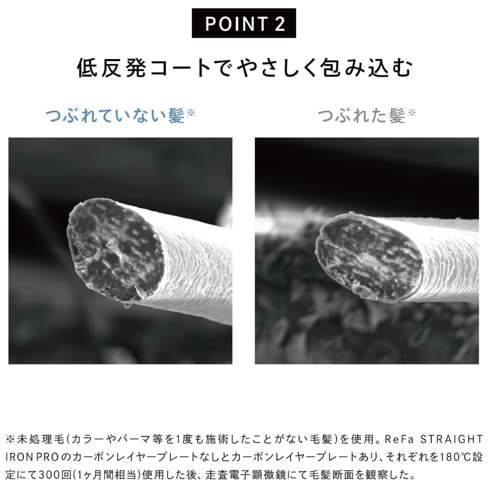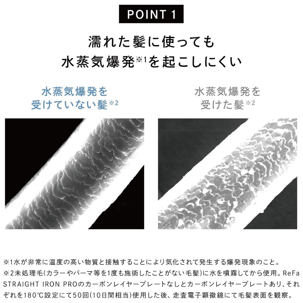 ReFa STRAIGHT IRON PROが再現するのは、 サロン帰りの髪のようなしっとりやわらかな髪。表面はしっかり乾いているのに、水分がギュッと詰まったレア質感をつくりだします。挟む力もよりアップして、質の高い理想のストレートがより簡単に。