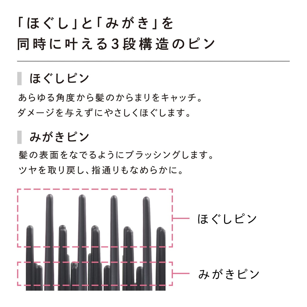 〈ほぐしピン〉あらゆる角度から髪のからまりをキャッチ。ダメージを与えずにやさしくほぐします。〈みがきピン〉髪の表面をなでるようにブラッシングします。ツヤを取り戻し、指通りもなめらかに。
