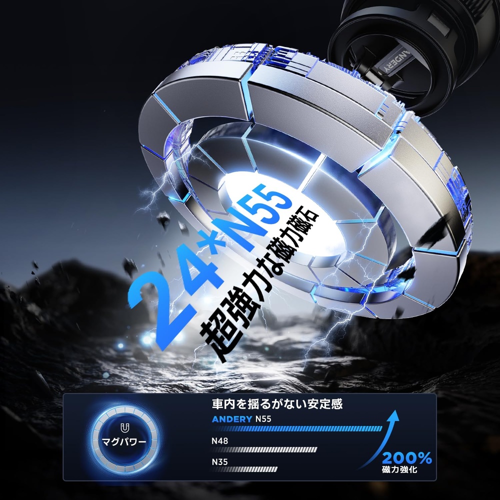 【革新的設計!磁力+真空ゲル吸盤の車載スマホホルダー最強コンビ】ANDERYお客様の声を基に、画期的な磁力+真空ゲル吸盤のスマホホルダー 車を開発しました。この新製品は、「磁力不足」「頻繁な脱落」「粘着力が足りない」「取り付けが複雑」といった問題を完全に解決します。業界最強の24個のN55磁石を採用し、吸着力は通常の車載ホルダーの200倍以上!吸着力は最大6kgに達し、これはiPhone 16 Pro Max 24台分の重量に相当します。さらに、独自のS/N双極交替磁場設計により、磁力を最大限に引き出しながらスマホの操作や通信に一切影響を与えません。車スマホホルダーの真空ゲル吸盤は従来の3M底盤に比べて50%大きく、吸着力が100%向上。真空ゲル吸盤 直径約7.2cm。真空ロック装置で空気を排出することで、しっかりと固定され、急ブレーキやデコボコ道でも安心してご使用いただけます。ANDERYで、毎回のドライブがさらに安心・安全に!